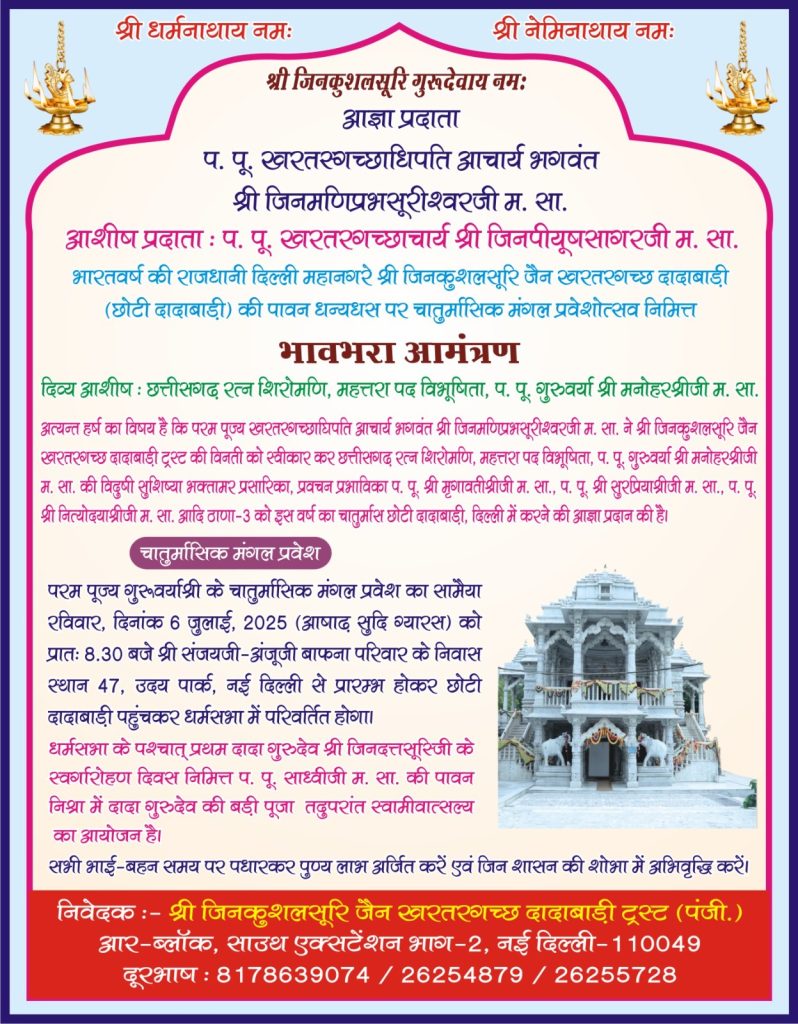 छोटी दादावाड़ी नई दिल्ली में 6 जुलाई को चातुर्मास प्रवेश